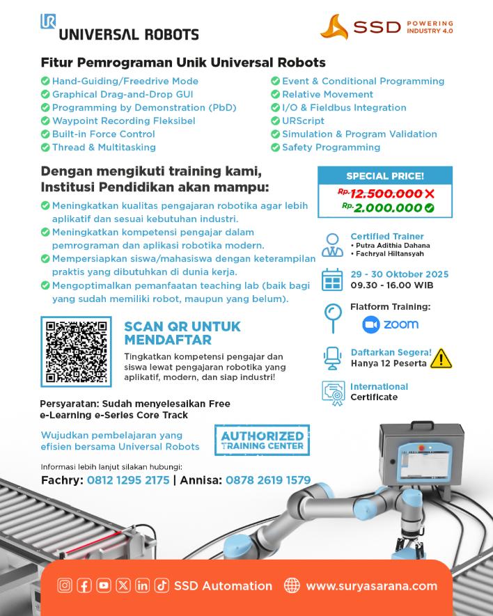 💡 Saatnya tingkatkan kualitas pembelajaran robotika dengan Online Training – Simulator Based dari Universal Robots & SSD Automation!