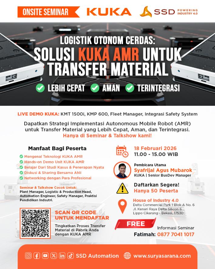 SSD Automation bersama KUKA menghadirkan Onsite Seminar & Live Demo yang membahas penerapan Autonomous Mobile Robot (AMR) sebagai solusi logistik modern di lingkungan industri.